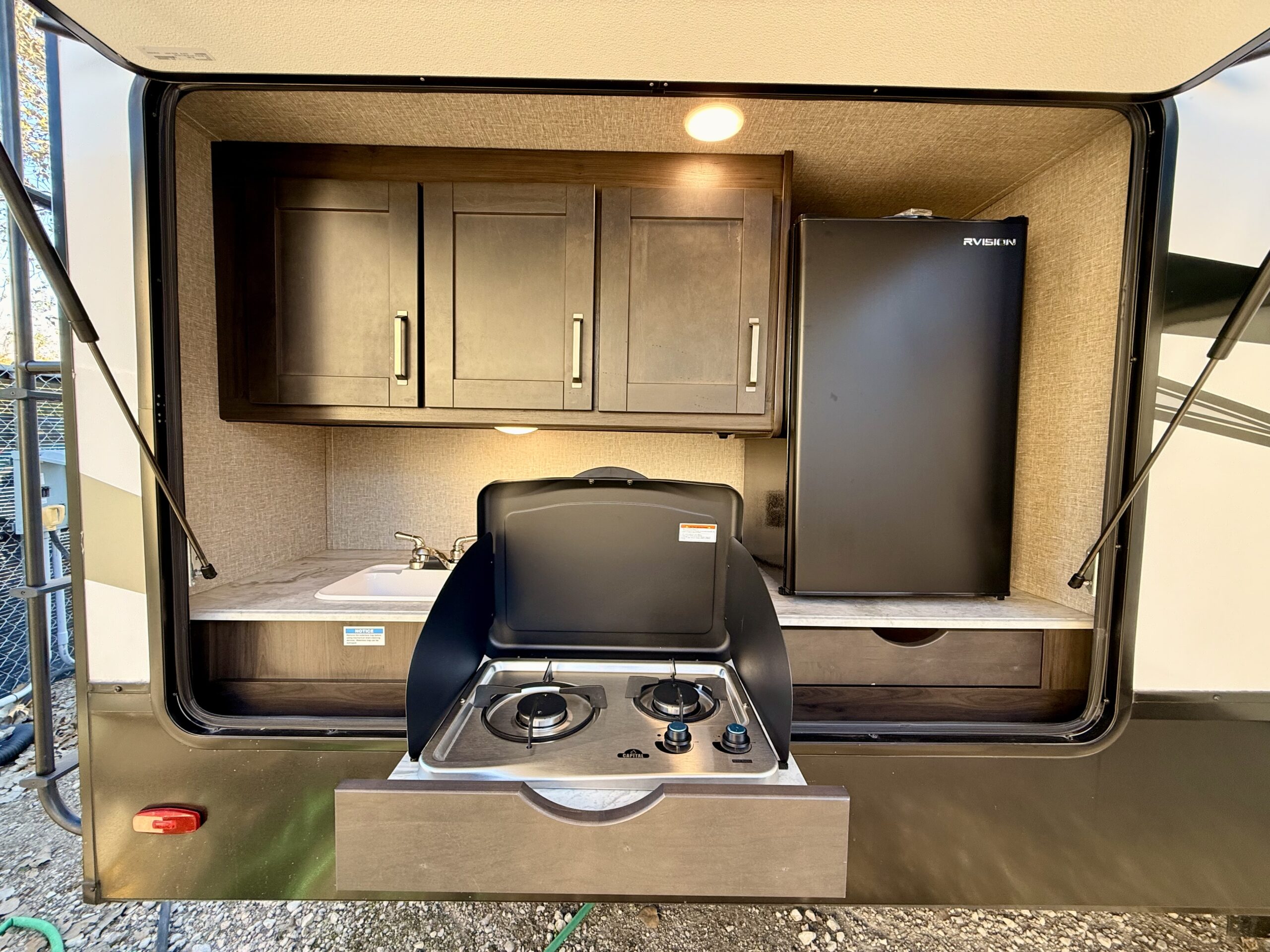 • Outdoor kitchen with mini fridge, cooktop, and storage