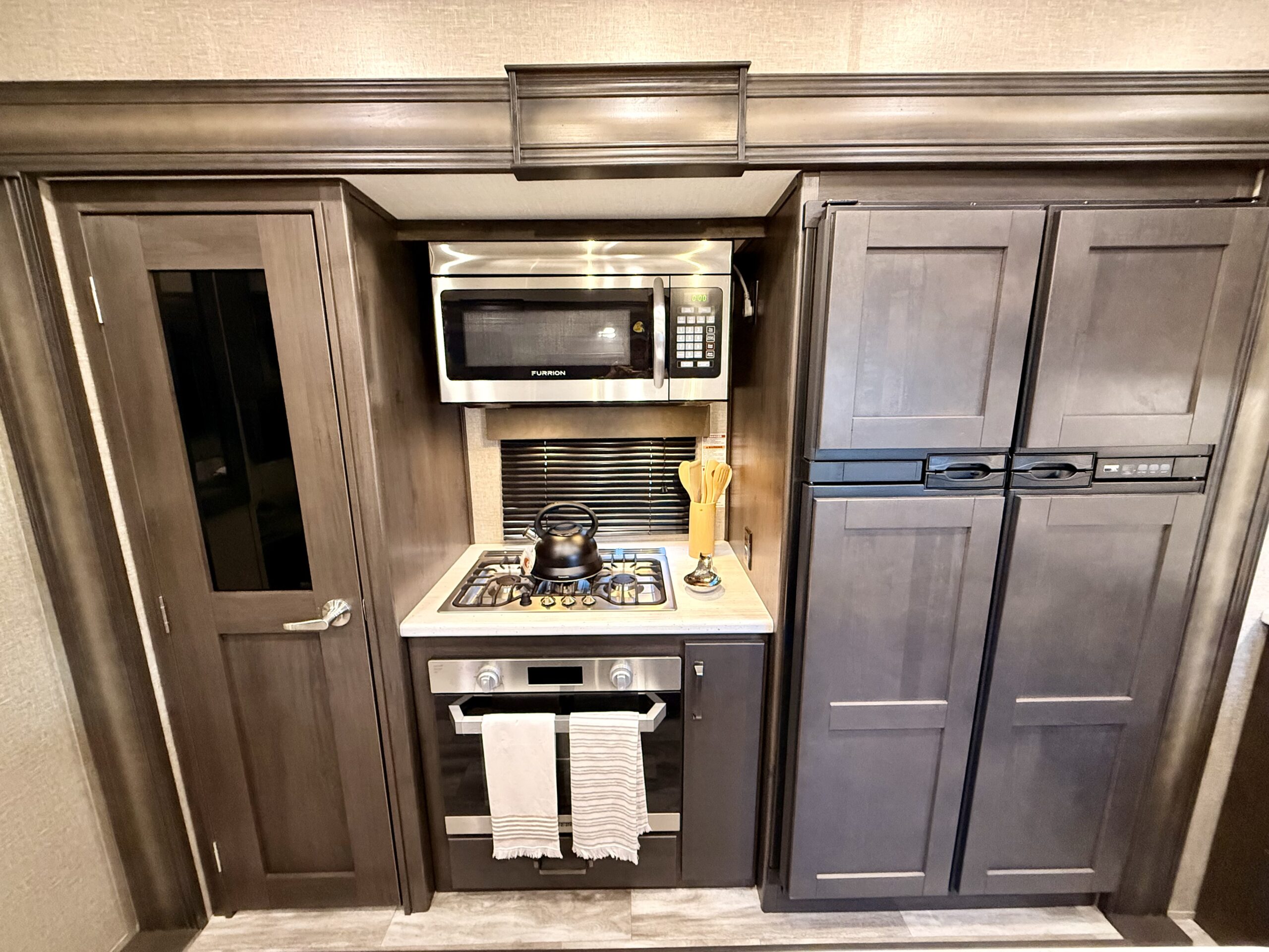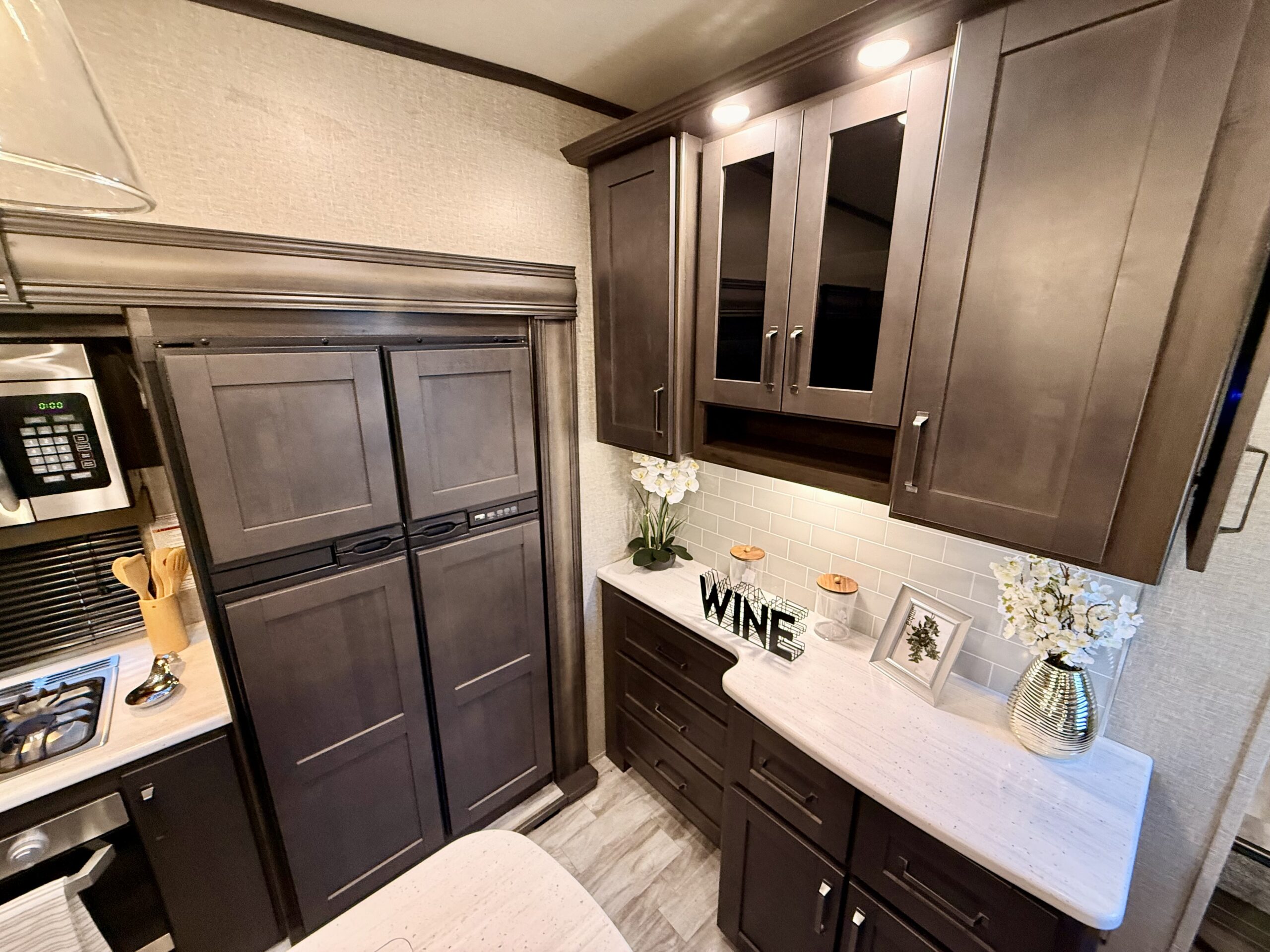 • Full kitchen with island, side-by-side refrigerator, and ample storage